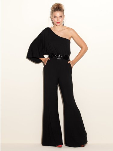 This ultraglam one-sleeve jumpsuit is a must-have for the season. Look sexy as you expose your shoulder, yet smile inside about how comfortable you feel in this soft knit one-piece. Pair with a blazer for work or wear alone for a night on the town. ? Asymmetrical neckline. Single three-quarter length draped sleeve. ? Belt included. Wide, flared leg. Side slash pockets. ? 10 ½" front rise ? 13 ½" back rise ? 15 ¾" leg opening ? 34" inseam ? 95% Rayon, 5% Spandex ? Hand wash Measurements taken from a size medium Women > Jumpsuits & Rompers